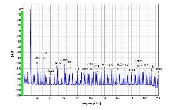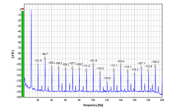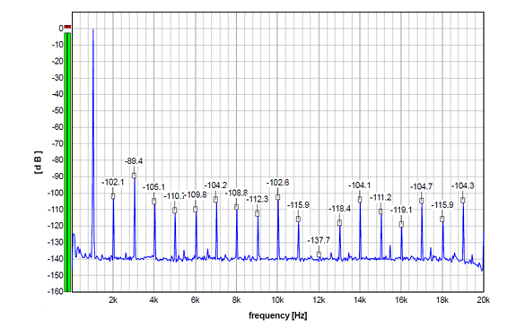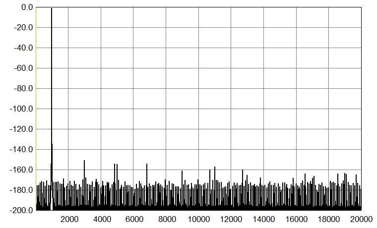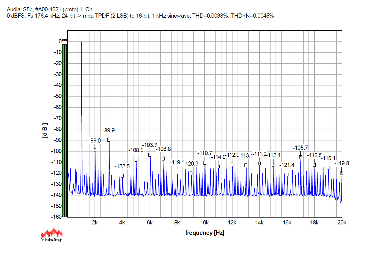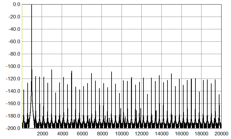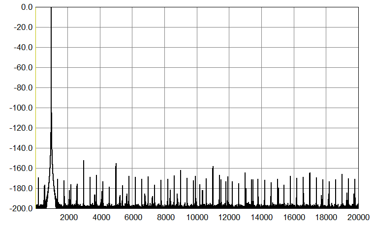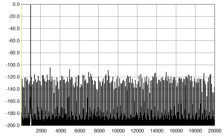 Going back to 1 kHz, the graph below shows an undithered 1 kHz sinewave with Fs 176.4 kHz (it is 24-bit, normally truncated to 16 bits), again run through my Audial S5 prototype. Please compare this graph with the first one above. Harmonically related components are similar, but the amount and the level of the other discrete artifacts is lower.