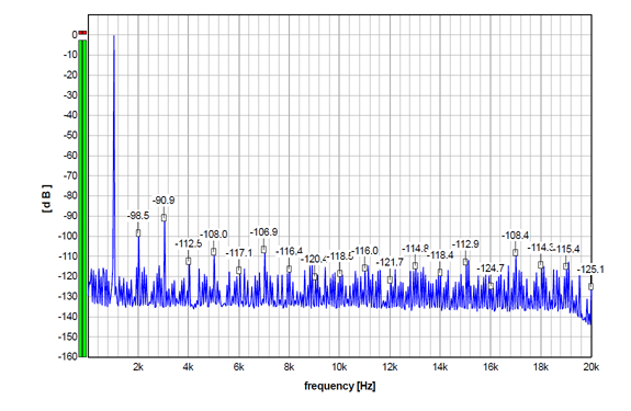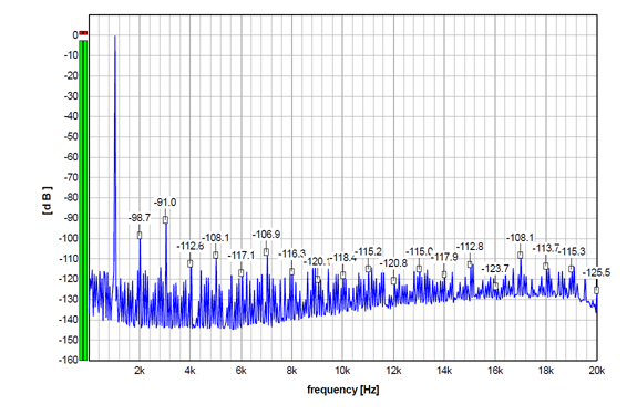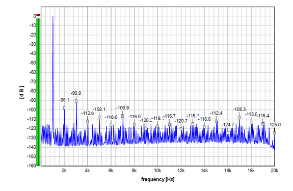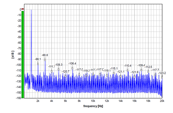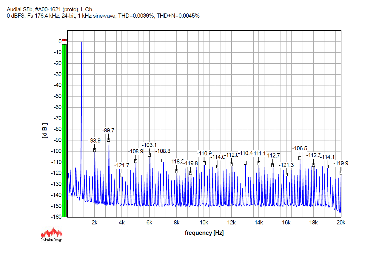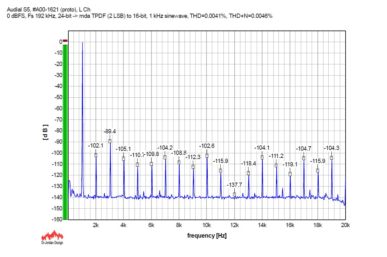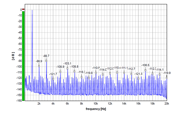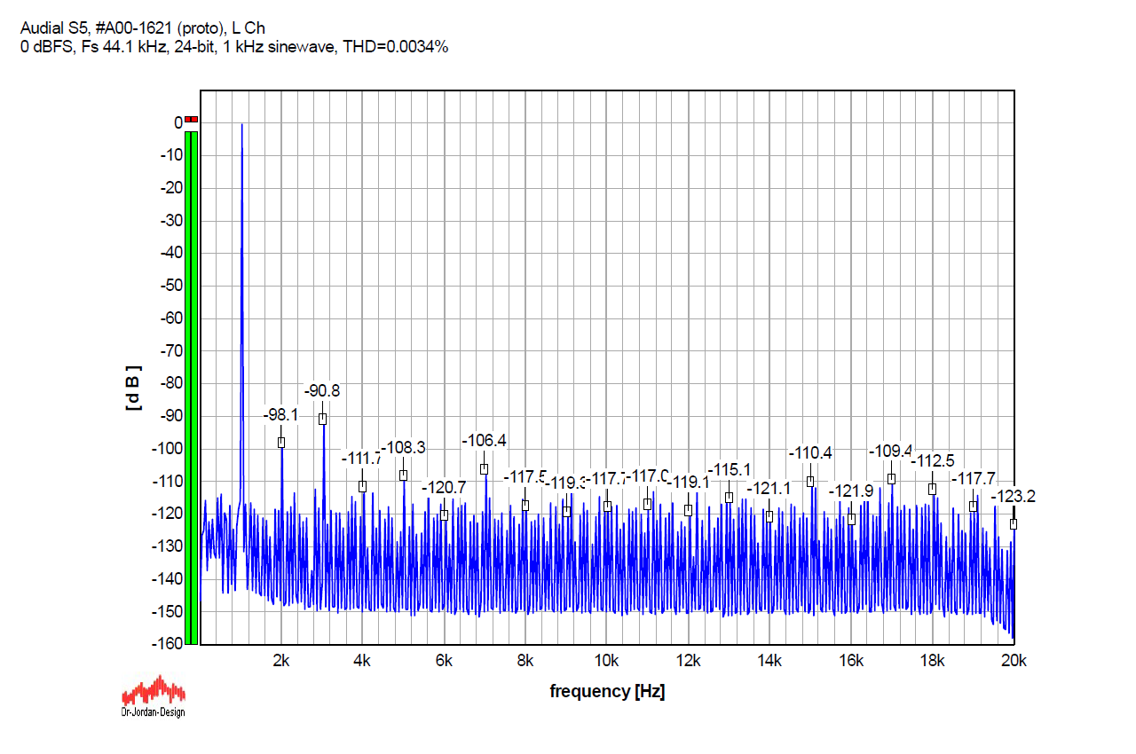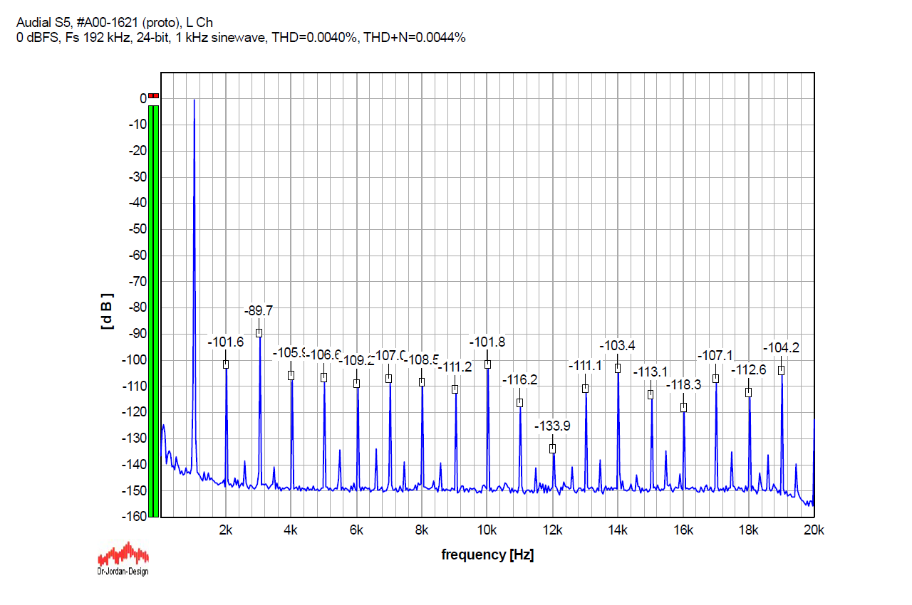 For the record, here is the S5 performance with 24-bit (undithered/truncated) 1 kHz sinewave sampled at Fs 192 kHz, which is a multiple of the sampled 1 kHz signal, so there is a whole number of samples per oscillation. Almost all the discrete components, apart from the harmonics, practically disappeared, so we can verify that non-harmonically related discrete artifacts in the graphs above are not produced by the DAC, but by the source signal itself.