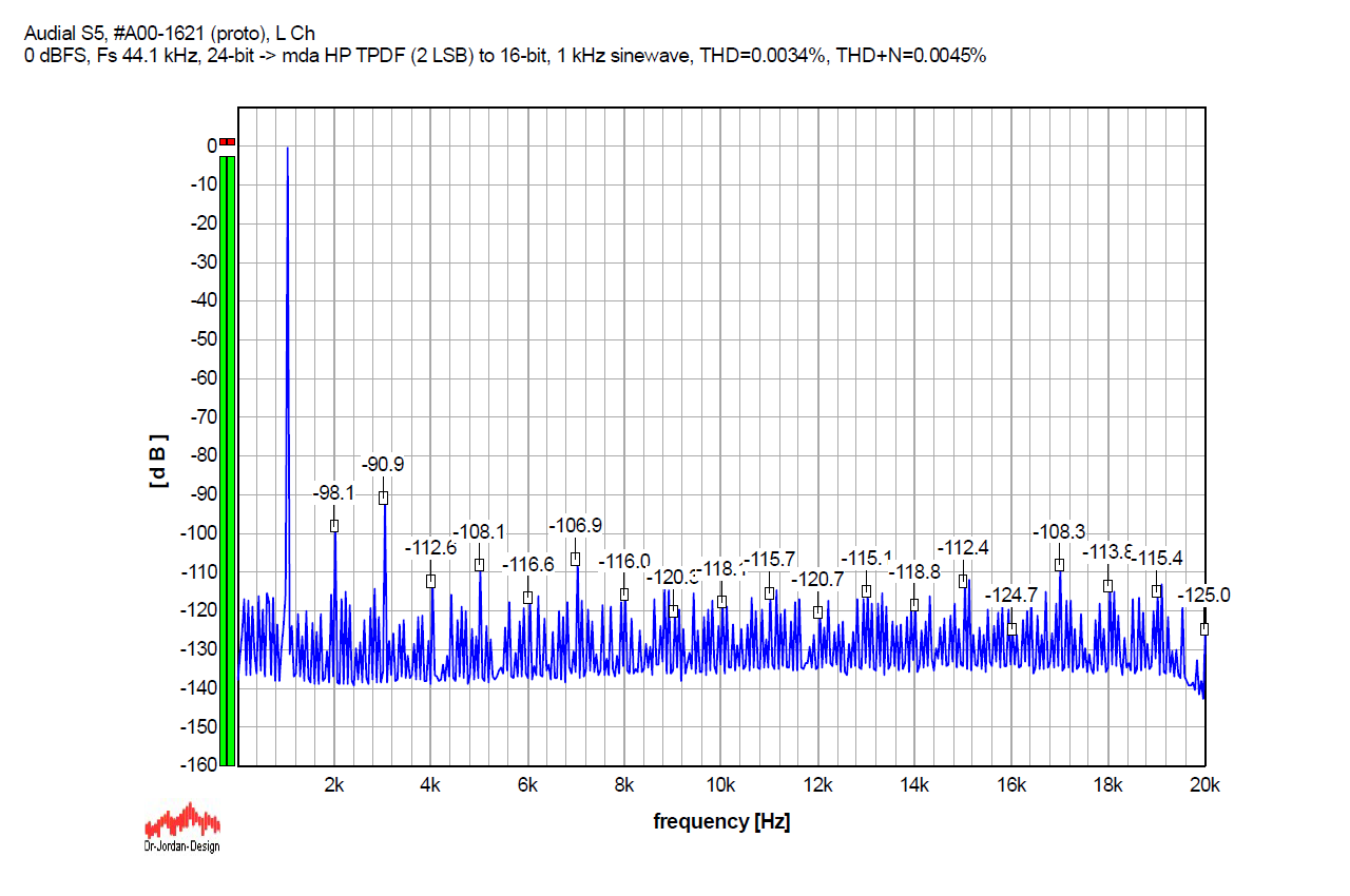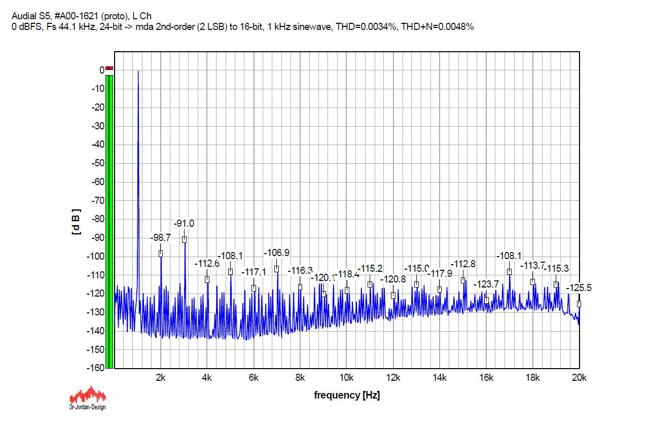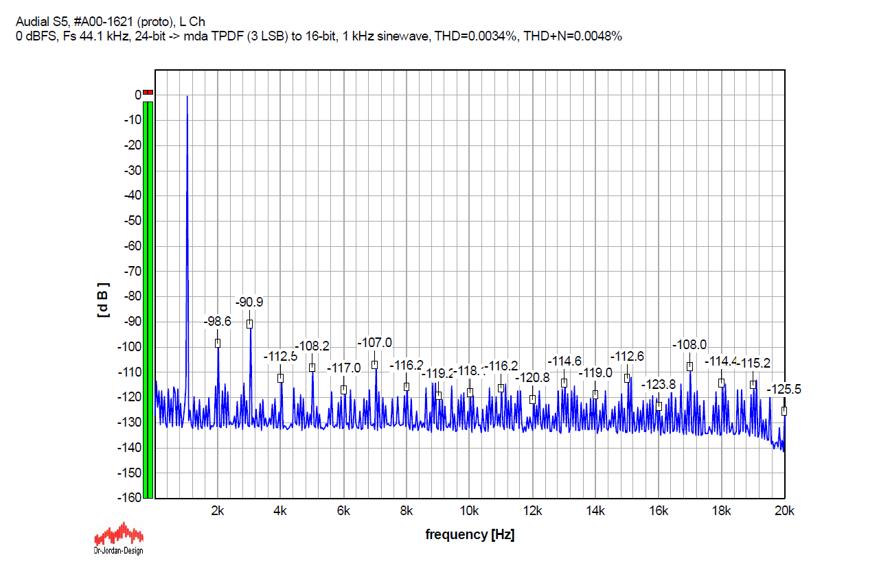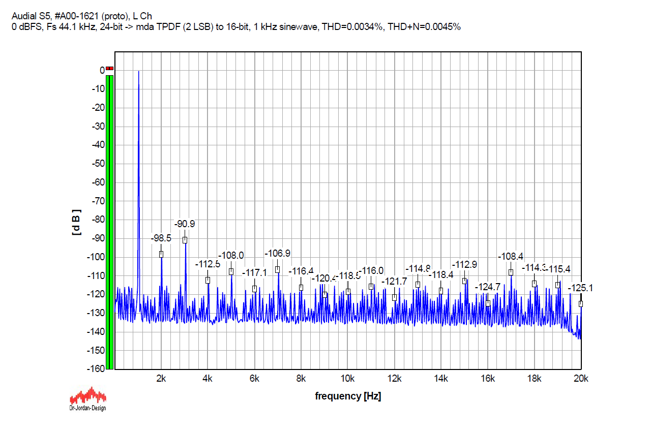 So, first, the graphs. Below, you will see the FFT graphs for a 24-bit 1 kHz sinewave, sampled at 44.1 kHz, played by the Audial S5 DAC, without and with several dither options. It is the original S5, my prototype sample, and not S5b, but the results would be similar with S5b too.